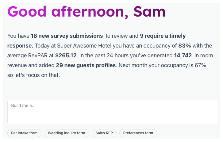 Start each day with clarity and focus. Pulse’s AI Agent delivers a personalized briefing, cutting through the noise to provide meaningful guidance and actionable recommendations specifically for your hotel’s operations, guest engagement, and marketing. It’s like having a seasoned concierge whisper the day’s top priorities and revenue opportunities directly to you.